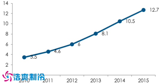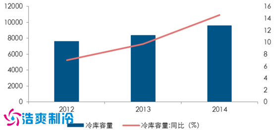 我國冷庫的容量和增長率(萬立方米)