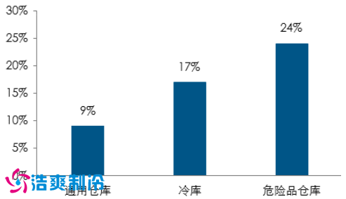 從倉庫種類來看,傳統(tǒng)倉儲業(yè)的倉庫類型是以通用倉庫為主, , 占倉儲總面積的 97% 以上。通用倉庫通常儲存沒有特殊存放要求的貨物,例如家電、服裝和快速消費品等,但是通用倉儲的平均利潤只有 9%; 冷庫和危險品倉儲等倉庫所占的比例分別大約為 1.3%和 0.8%。雖然冷庫和危險品倉儲平均利潤率可以達到 20%左右,但是對技術和人員的要求也很高,進入壁壘較高。