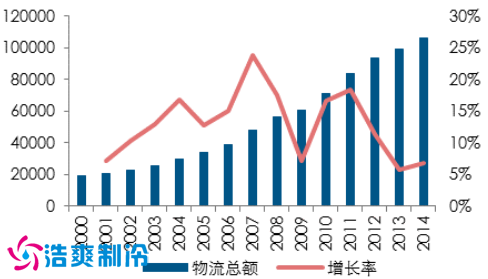 我國物流行業(yè)持續(xù)發(fā)展,2014年我國物流總費用可達到 10.6 萬億元,同比增長 7%。從物流業(yè)增長值的比例構成上看,盡管交通運輸在物流也得比例可達 70%左右, 但倉儲業(yè)占物流業(yè)年增長值的比例在不斷上升,2014 年可達到 8.81%。